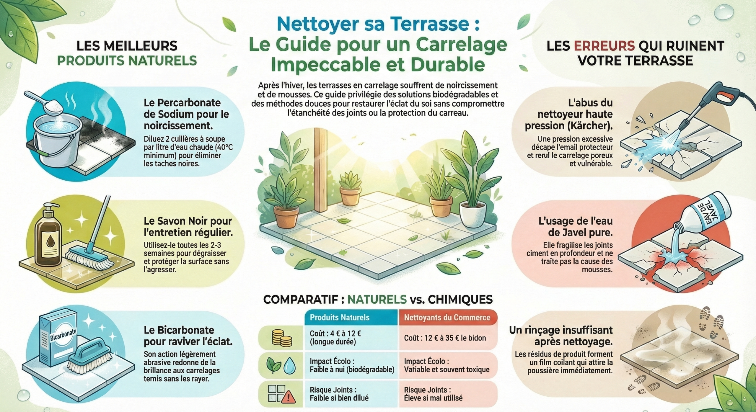 📌 L’essentiel à retenir. Pour un entretien courant, le savon noir dilué dans l’eau chaude suffit. Face à une terrasse noircie, le percarbonate de sodium donne les meilleurs résultats sans agresser le carrelage. Et si le noircissement revient malgré vos efforts, le problème vient probablement du carrelage lui-même (devenu poreux) ou d’un défaut d’écoulement, pas d’un manque de nettoyage.